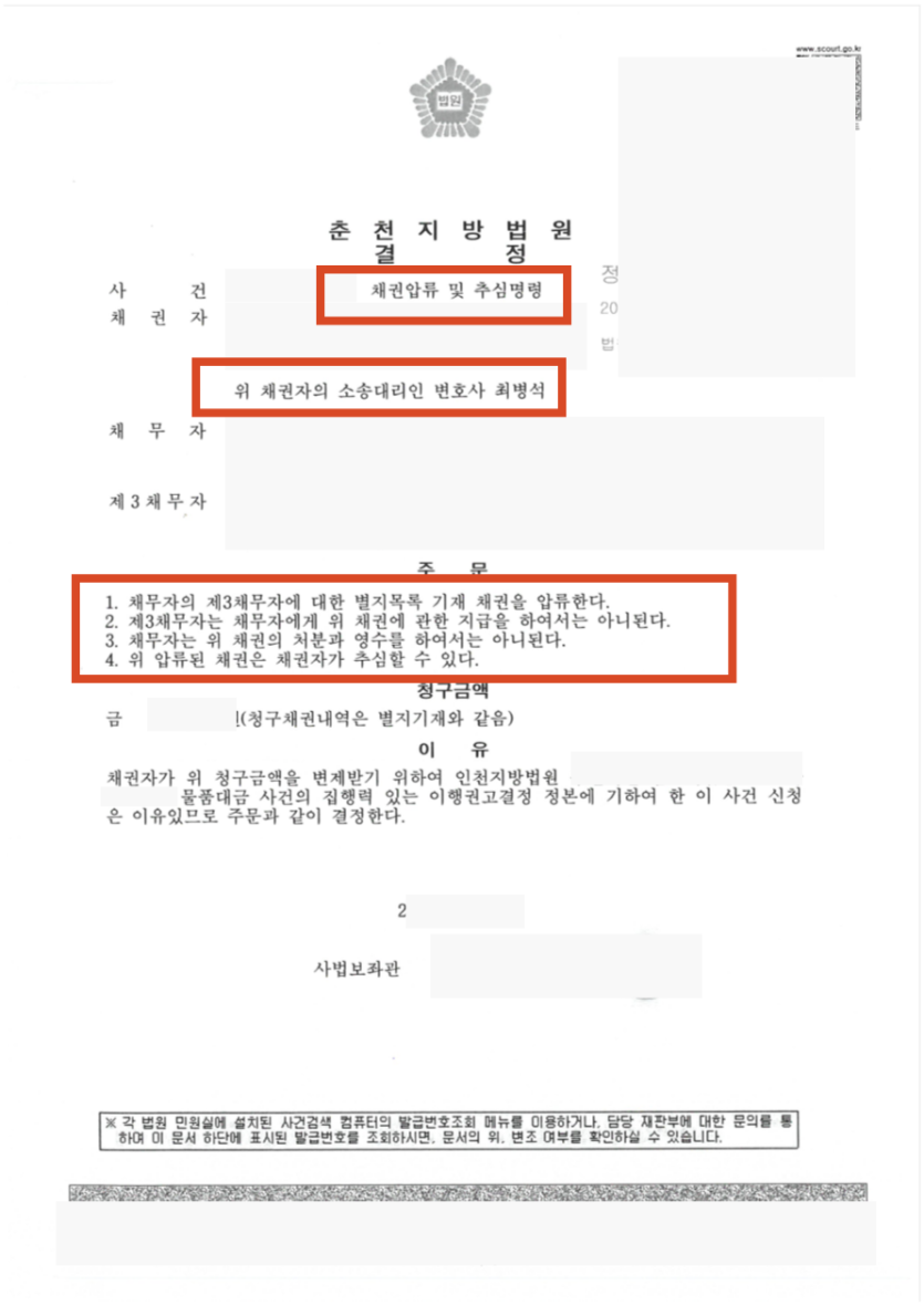 피고의 채무 이행 거부에 따라 법원은 법무법인 우경이 신청한 채권압류 및 추심명령을 인용하여, 원고가 피고의 특정 재산으로부터 미지급된 잔금을 회수할 수 있도록 했습니다.