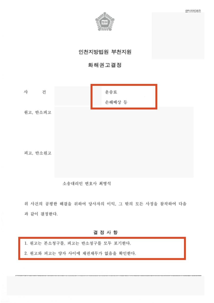 결과적으로 화해권고 결정을 내렸으며, 원고와 피고는 각자의 청구를 포기하고 더 이상 일체의 채권채무가 없음을 확인한다는 결정을 내렸습니다.