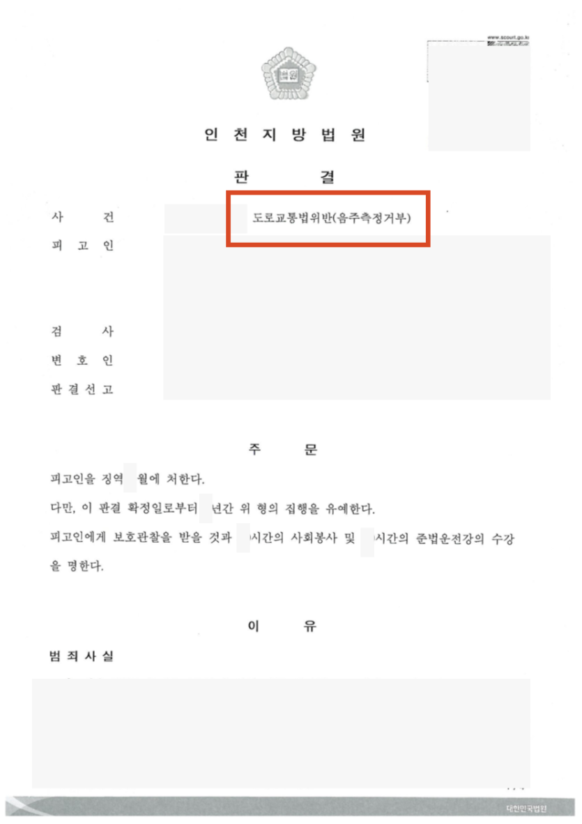 음주측정거부죄는 처벌 수위가 높고 대응이 까다로운 범죄이지만, 법무법인 우경의 조력에 의하여 집행유예를 선고받을 수 있었습니다.