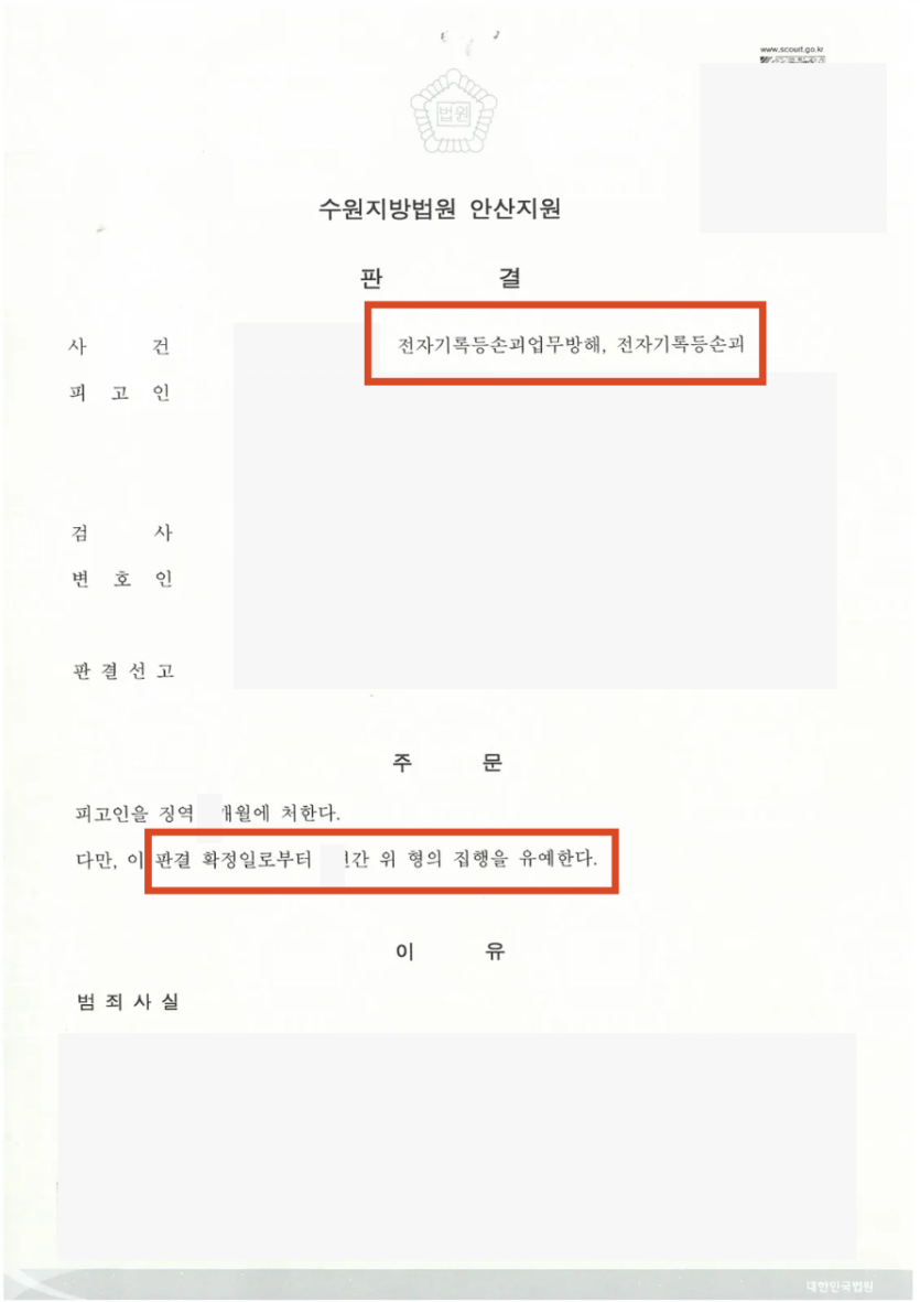 전자기록 등 특수매체기록 손괴죄 집행유예 사례