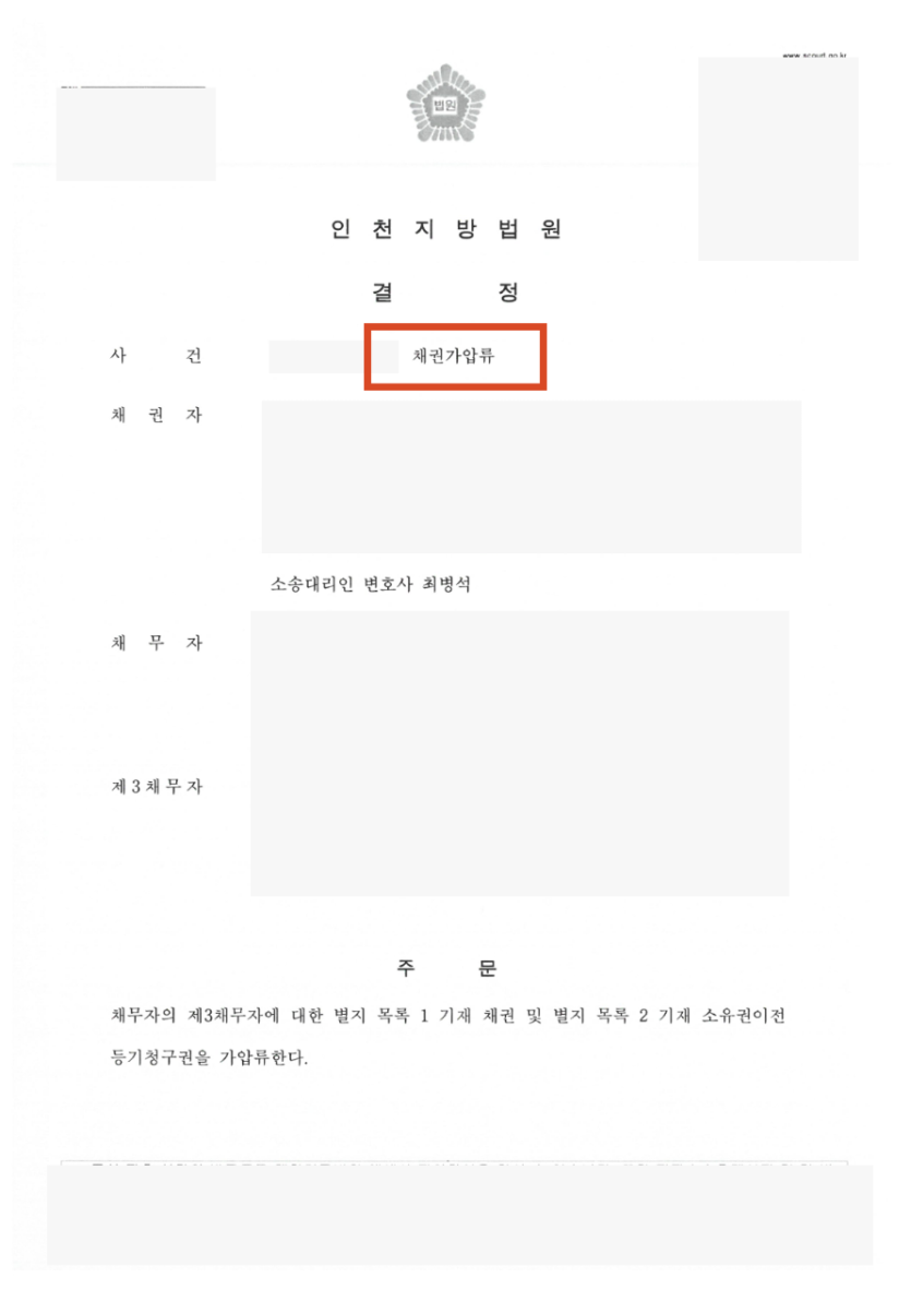 법원은 변호인의 주장을 받아들여 피고의 채권에 대한 가압류 신청을 인용했습니다.