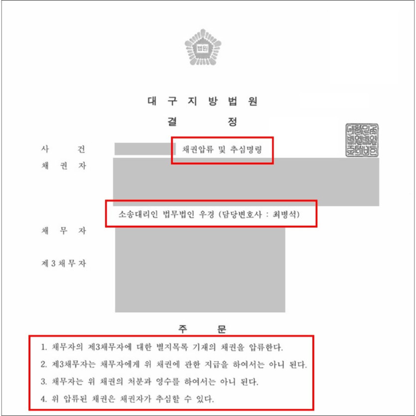 이에 법무법인 우경은 채무자가 제3자에 대해 보유하고 있는 채권을 대상으로 채권압류 및 추심명령을 신청하였습니다.