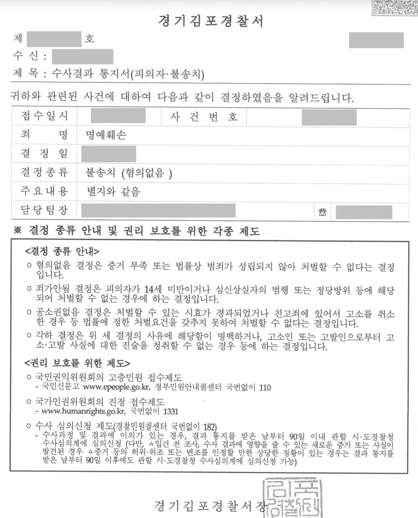 이에 따라 사건은 검찰로 송치되지 않고 불송치(혐의없음) 결정으로 종결되었습니다.