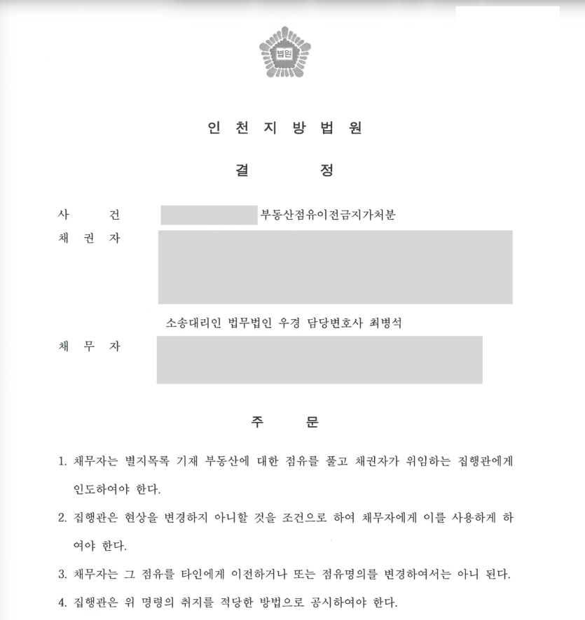 이에 의뢰인은 본안 소송과 함께, 점유 상태를 고정하기 위한 긴급한 법적 조치가 필요하다고 판단하여 법무법인 우경을 통해 부동산점유이전금지가처분을 신청하게 되었습니다.