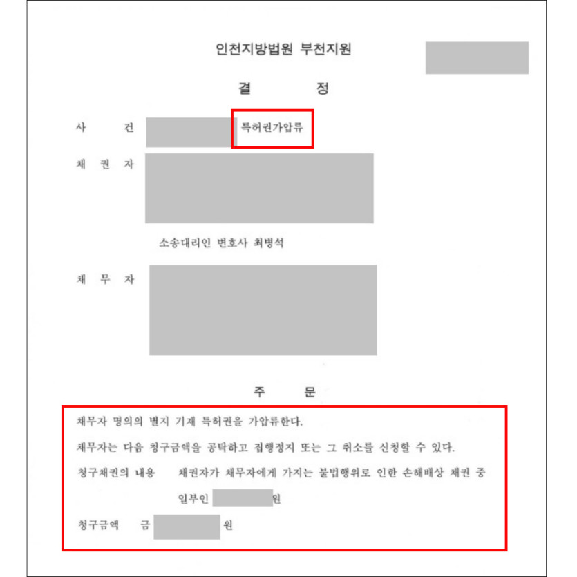 민사·손해배상 특허권 가압류로 기업 손해배상 소송에서 실질적 회수를 이끈 사례 가압류 결정 25-09-11 관련링크 목록 사건 개요 의뢰 기업은 거래 상대방 회사의 불법행위로 인해 수억 원 상당의 금전적 피해를 입었습니다.상대방은 자산을 다른 명의로 이전하거나 회사 명의 재산을 정리하려는 정황을 보이고 있었기에 법무법인 우경은 피해금액에 대한 손해배상 청구와 동시에, 해당 회사의 특허권을 가압류하는 전략을 함께 진행하였습니다. 법무법인 우경의 조력 법무법인 우경은 본 사건에서 다음과 같은 전략적 조력을 제공하였습니다.상대방의 자산현황 사전 파악 및 특허 정보 추척손해배상청구와 가압류를 동시에 진행해 압박 효과 극대화보증보험을 활용한 담보 제출 절차를 신속히 처리추후 본안소송에서도 입증 책임과 방어전략 설계그 결과, 상대방은 조속히 합의에 응하게 되었고, 의뢰 기업은 실질적인 금전 회수에 성공할 수 있었습니다. 법원의 판단 법원은 다음과 같이 판결하였습니다."채무자 명의의 특허권에 대한 가압류를 결정하며, 청구금액은 ○억 원으로 한다. 신청인은 담보로 보증보험증권을 제출하였고, 이에 따라 가압류를 인가한다."가압류 대상이 된 특허는 실제로 상업적 가치가 높은 등록 특허들이었습니다. 목록