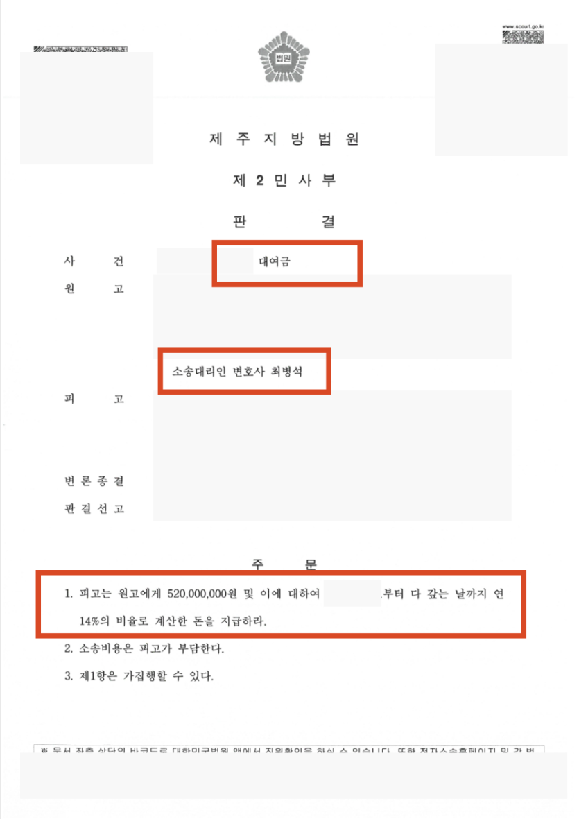 이후 법무법인 우경은 대여금 사건의 집행력 있는 판결정본에 기초하여 채권압류 및 추심명령을 신청하였고, 대여금을 회수할 수 있었습니다.